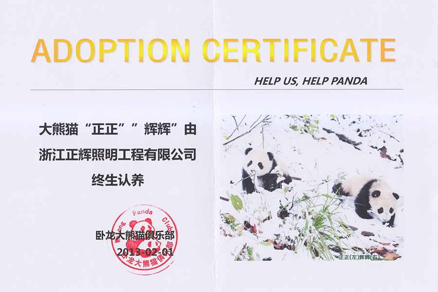 Zhenghui Company is committed to green lighting, advocating energy saving and environmental protection, and caring for the environment.In 2013, Zhenghui Company reached an agreement with the Wolong Giant Panda Club of the China Research Center for the Protection of Giant Pandas to adopt two giant pandas for life. They were named Zhengzheng and Huihui, demonstrating the company's social responsibility and efforts in environmental protection. Efforts.